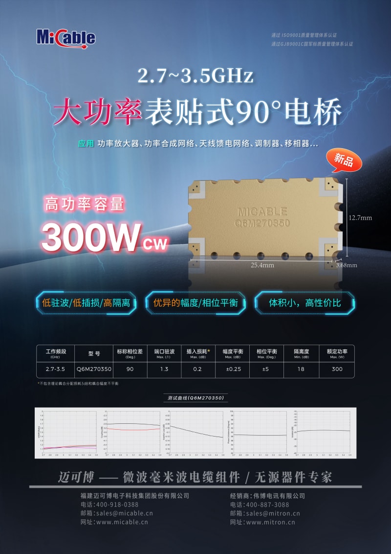 迈可博®推出的2.7~3.5GHz大功率表贴式90°电桥,实现小型化封装和高性价比的同时拥有优异的驻波比(1.3:1 Max.)、插入损耗(0.2dB Max.)、隔离度(18dB Min.)以及幅度/相位平衡(±0.25dB/±5° Max.),连续波功率处理能力达300W,具有良好的稳定性和散热能力,可广泛应用于功率放大器、功率合成网络、天线馈电网络、调制器、移相器等。