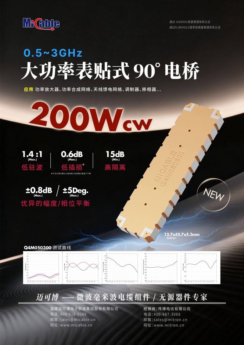 迈可博®推出的0.5~3GHz大功率表贴式90°电桥,实现小型化封装和高性价比的同时拥有优异的驻波比(1.4:1 Max.)、插入损耗(0.6dB Max.)、隔离度(15dB Min.)以及幅度/相位平衡(±0.8dB/±5° Max.),连续波功率处理能力达200W,具有良好的稳定性和散热能力,可广泛应用于功率放大器、功率合成网络、天线馈电网络、调制器、移相器等。