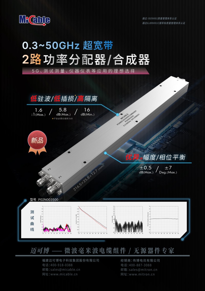 迈可博®推出的0.3~50GHz超宽带2路功率分配器/合成器,可将0.3~50GHz的1路输入信号转变为2路幅度、相位相同的输出信号。极宽的工作带宽和极佳的驻波比、插入损耗、隔离度以及幅度/相位平衡,使其成为 5G、测试测量、仪器仪表等应用的理想选择。