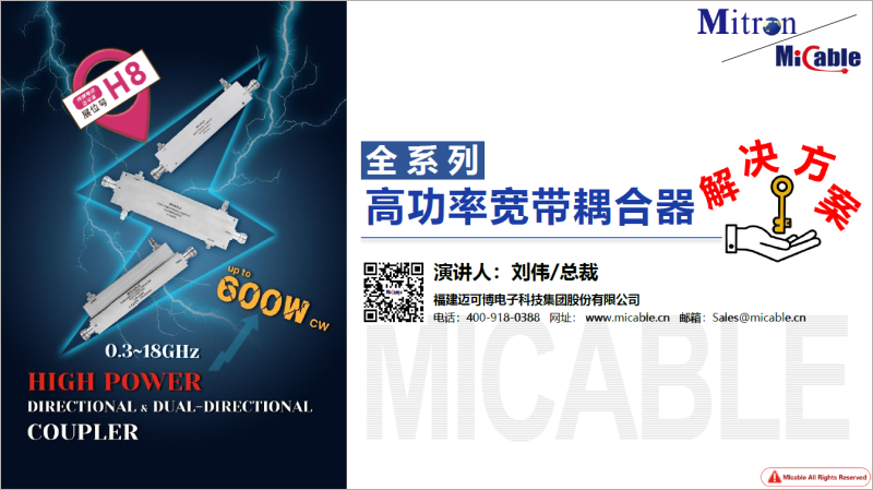 讲座主要介绍了耦合器在无线系统中的作用、封装类型,重点分析了耦合器的技术难点和该产品目前的全球市场现状,同时也分享了迈可博宽带/超宽带高功率耦合器领域的突破与创新能力,以及可提供的全系列解决方案,为与会者带来了全新的技术视角与行业洞察。